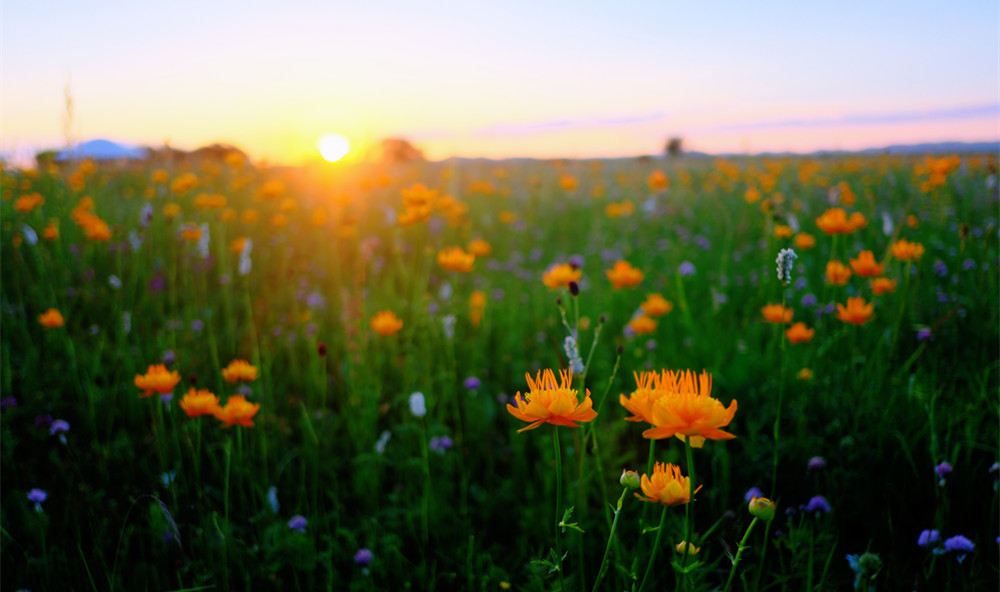 日落·正藍旗金蓮花海:陽光迷失在花蕊花朵綻放成太陽